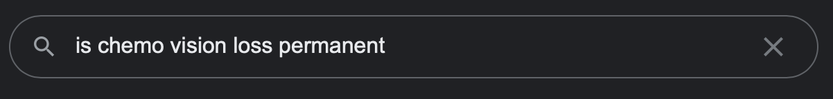 First, glasses would require knowing what prescription I would need. A definable number to say ‘hey this how bad your eyes are’. But my eyes just got worse and worse as treatment went on. So if I had got glasses at the start of the deterioration, I would’ve had to get new ones as they got worse.
